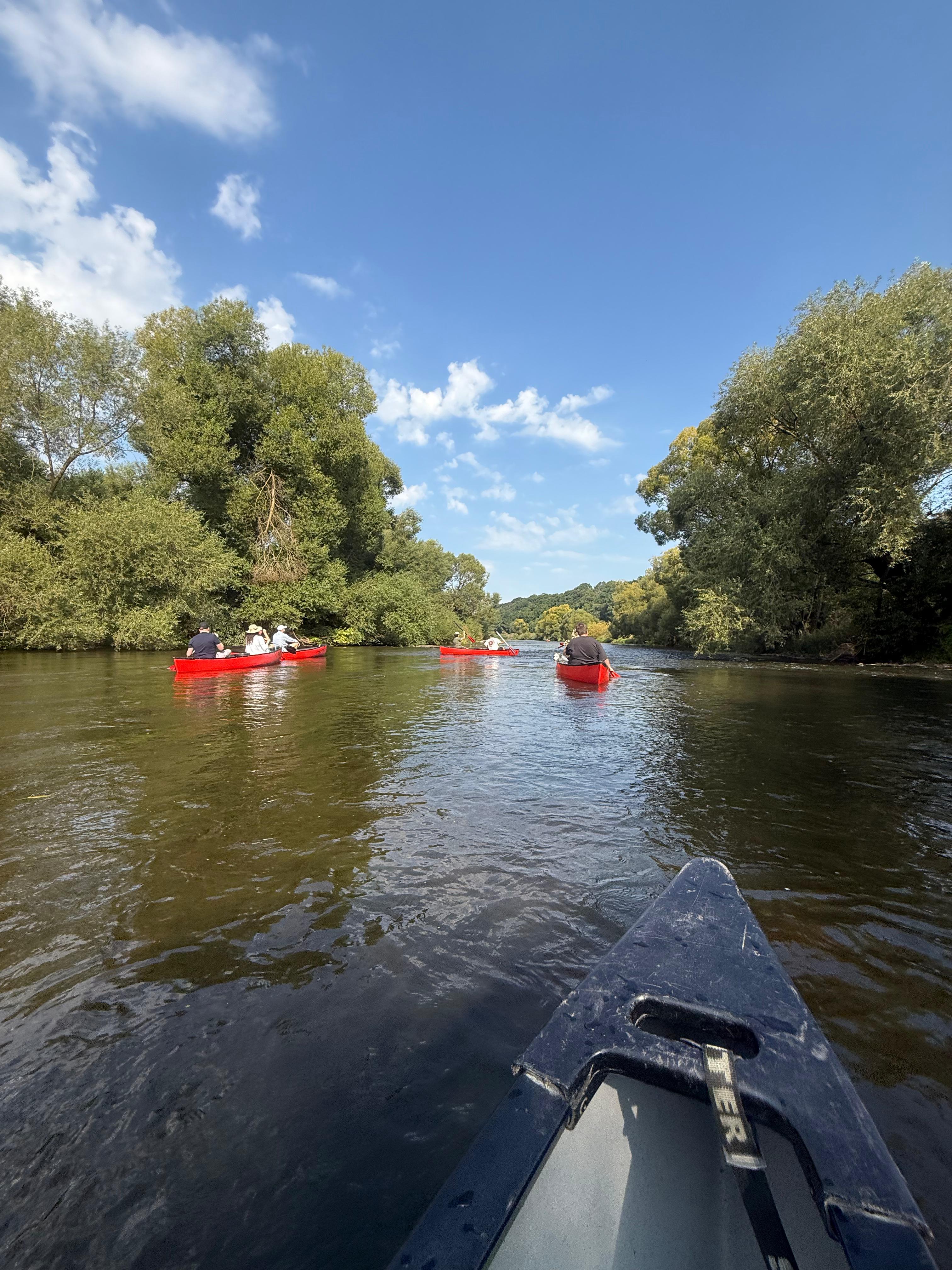 Hauptsächlich Umschüler:innen und einige Dozenten haben sich aufgemacht, um die Fulda mit dem Kanu zu erkunden. Eine willkommene Abwechslung zum Programmieralltag.